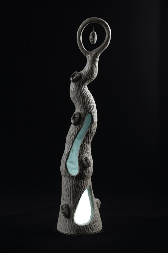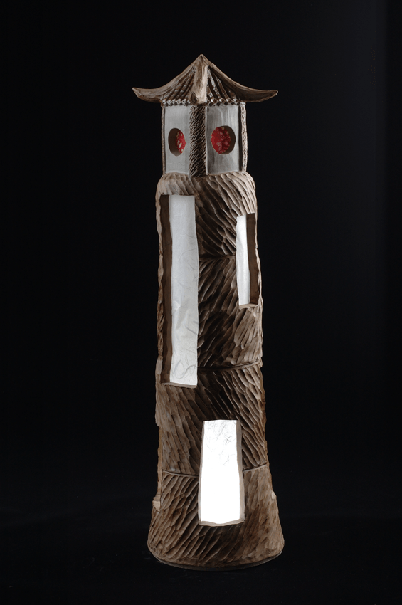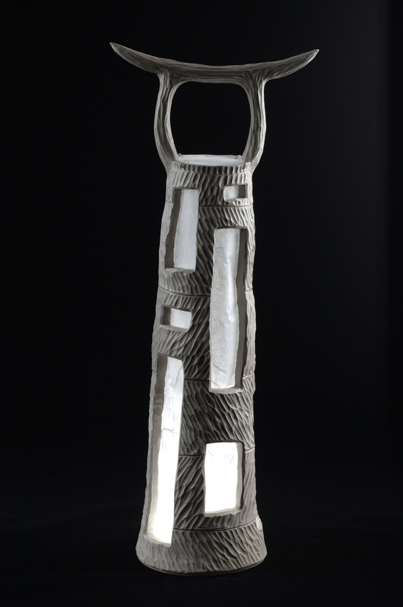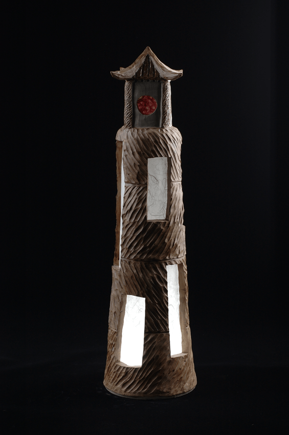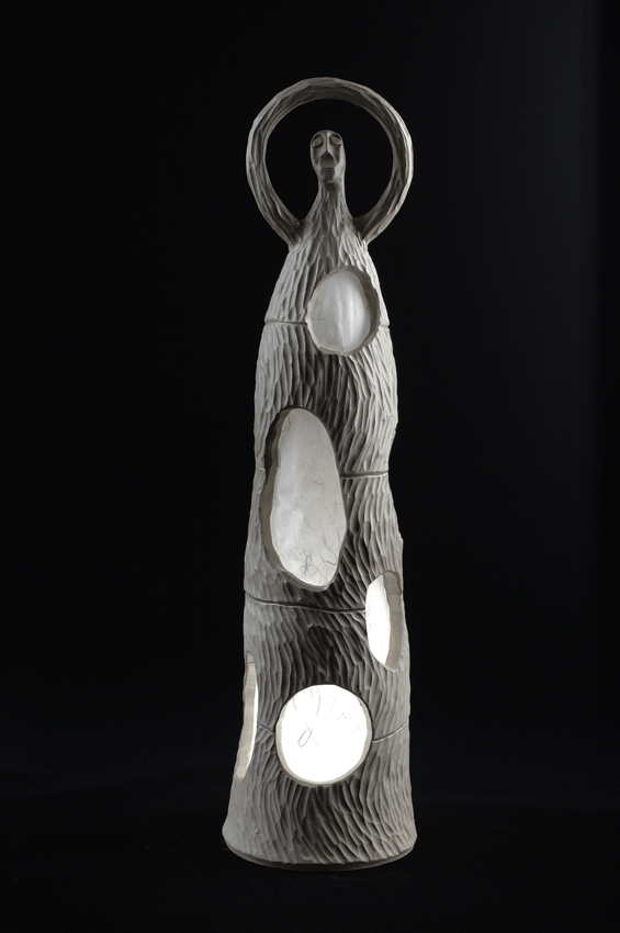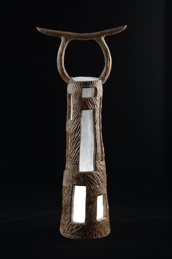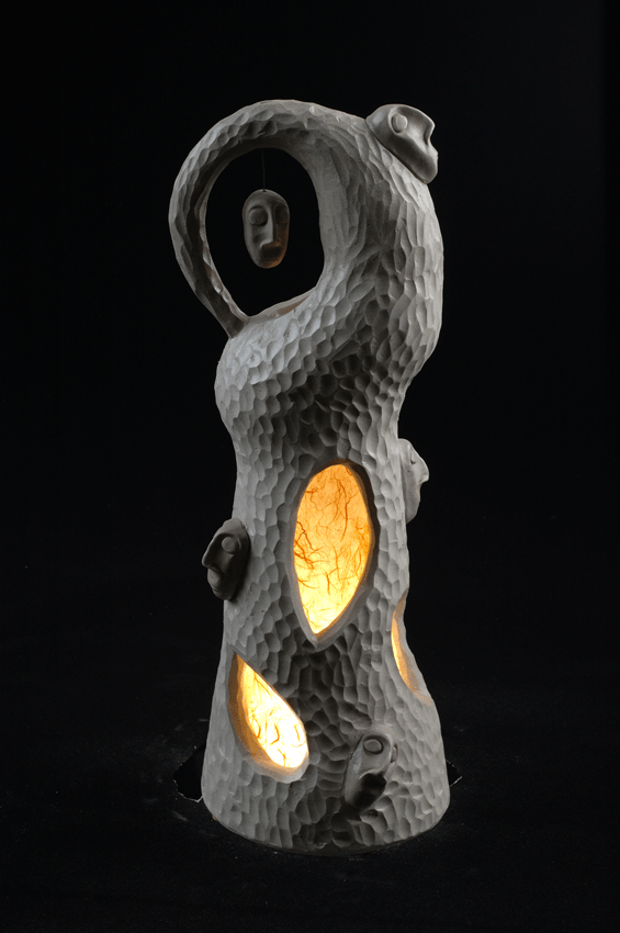 These lamps are made of a grey stoneware with rice paper laid into the carved holes. The light sits inside the sculpture on a hand- made base.