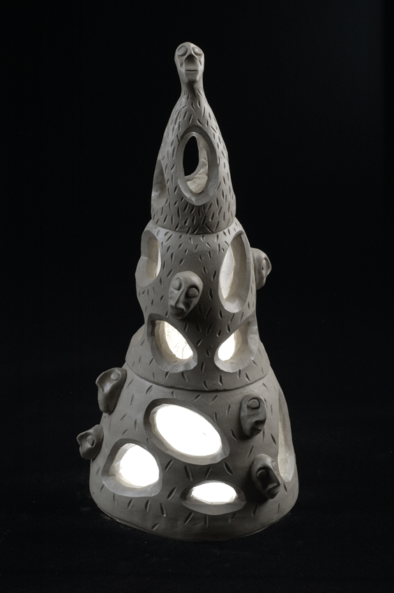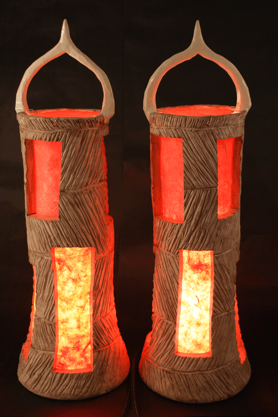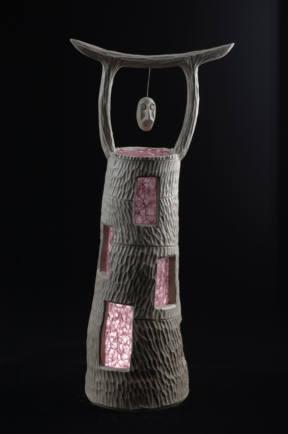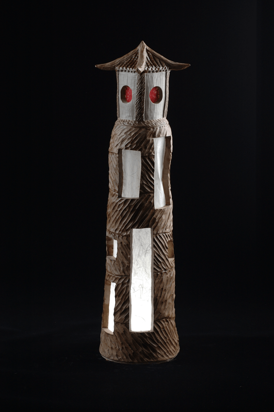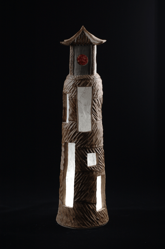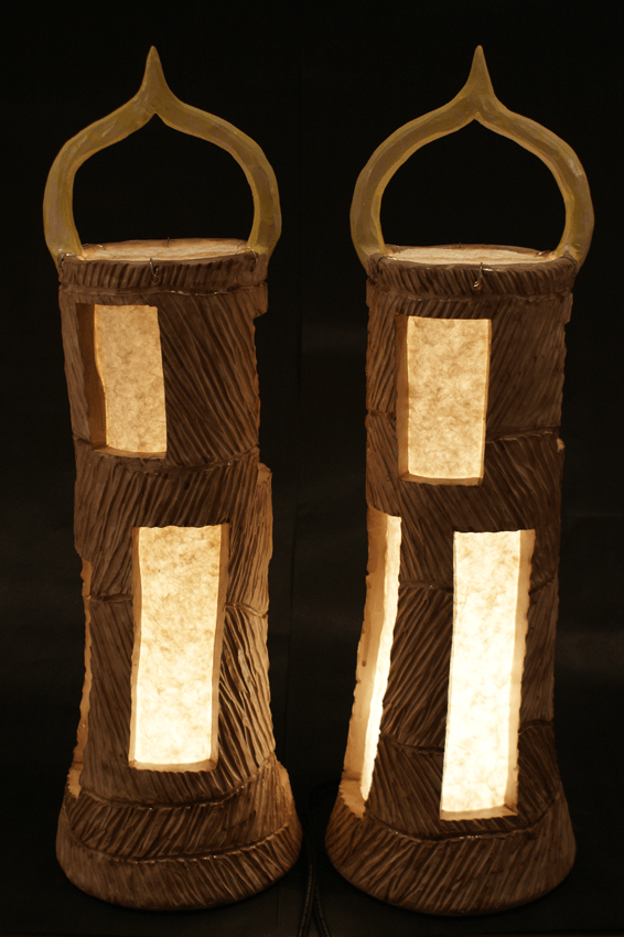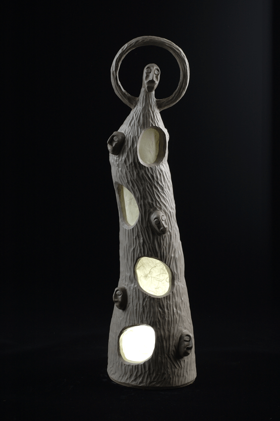 These lamps are made of a grey stoneware with rice paper laid into the carved holes. The light sits inside the sculpture on a hand- made base.